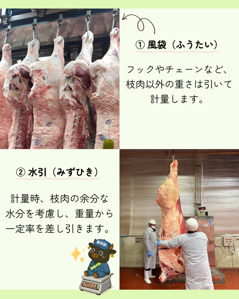 計量時、枝肉の余分な水分を考慮し重量から一定率を差し引きます。