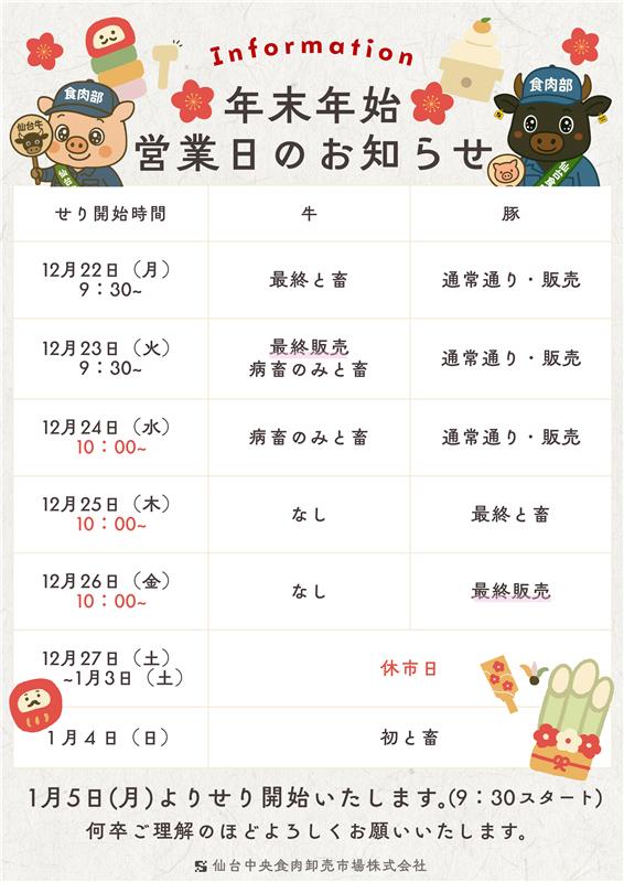 ※加工部、商品販売課(部分肉)は12月27日(土)も営業